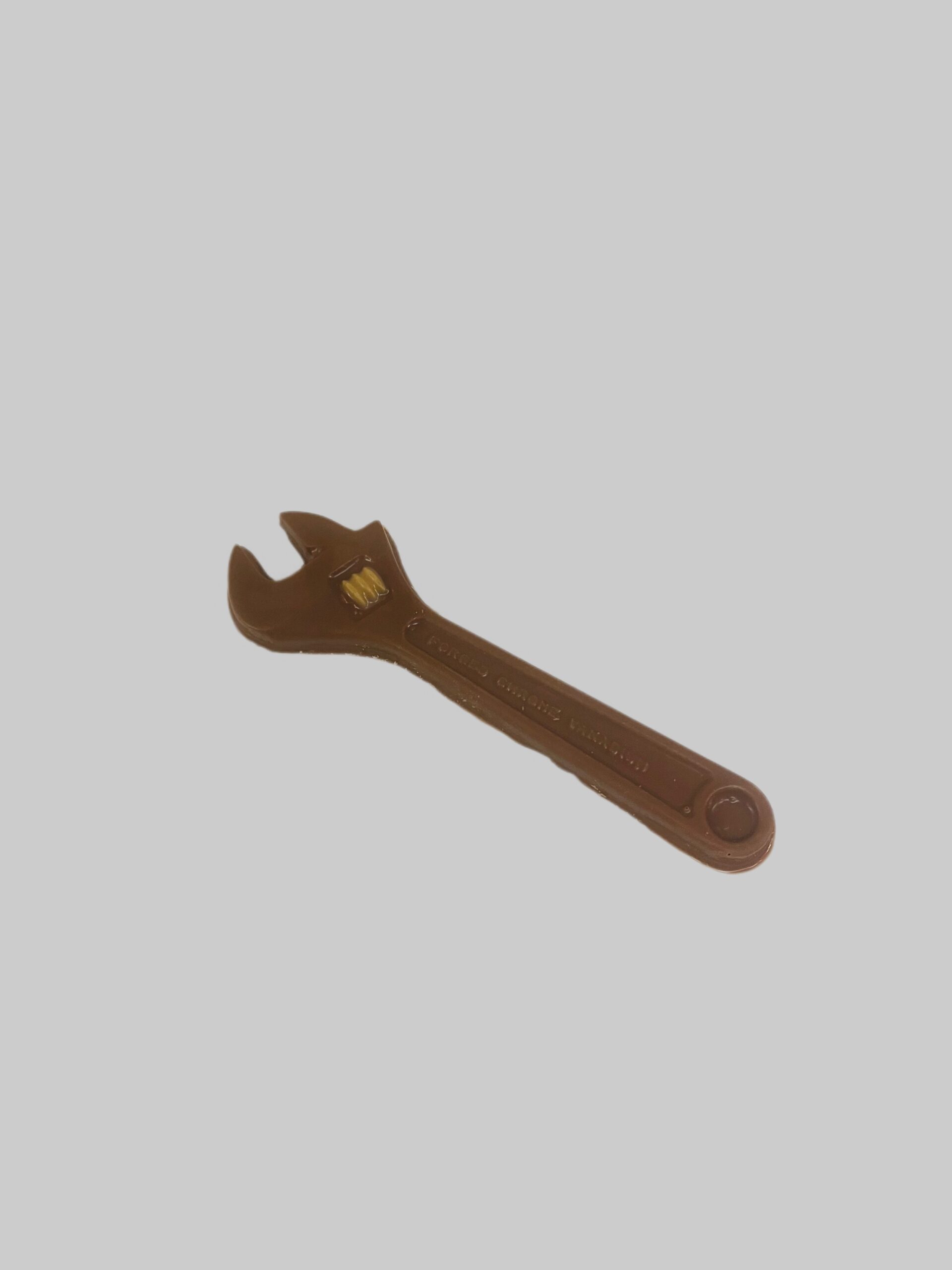 Clé à molette en chocolat au lait et décoration en chocolat bond.