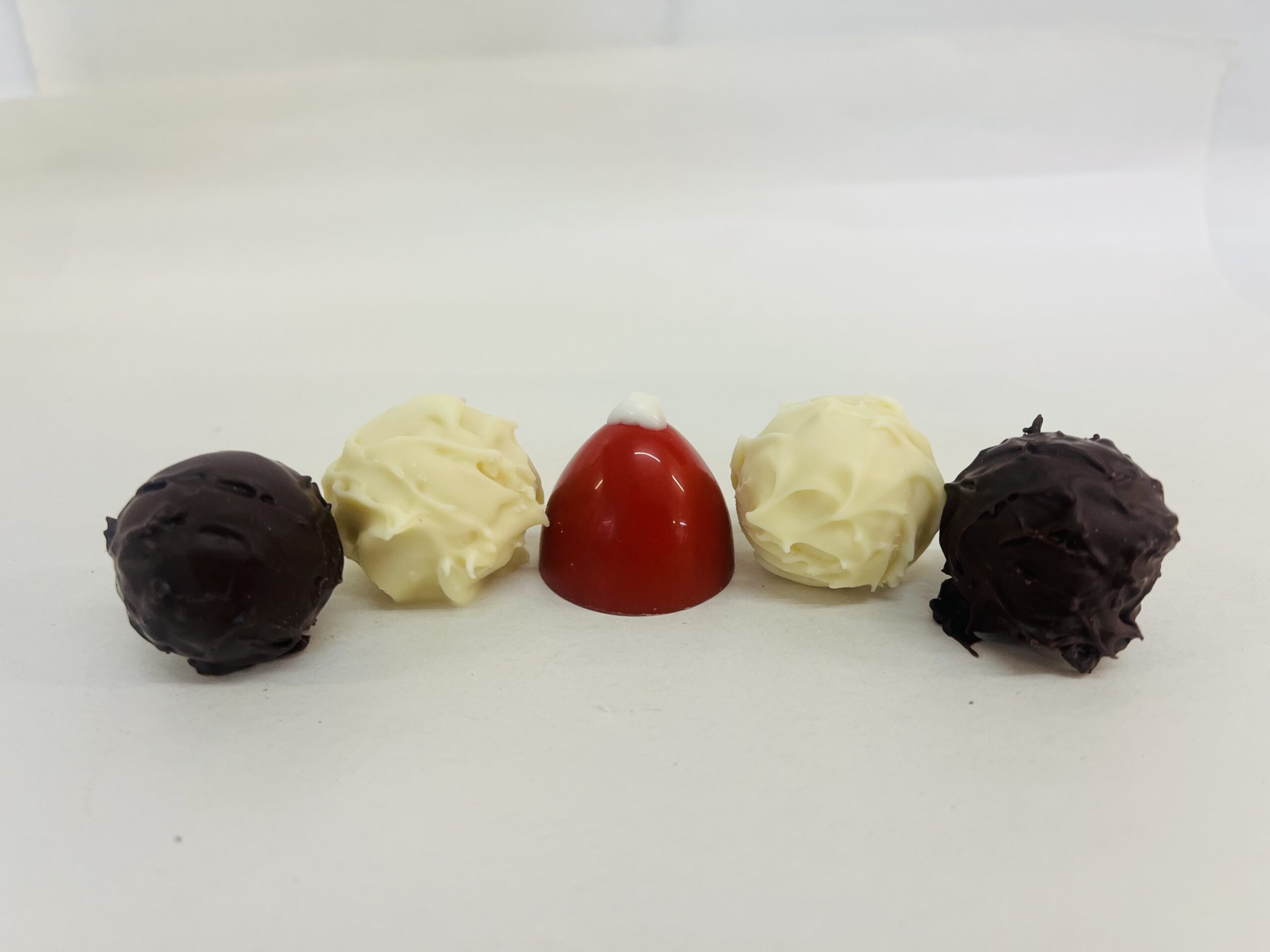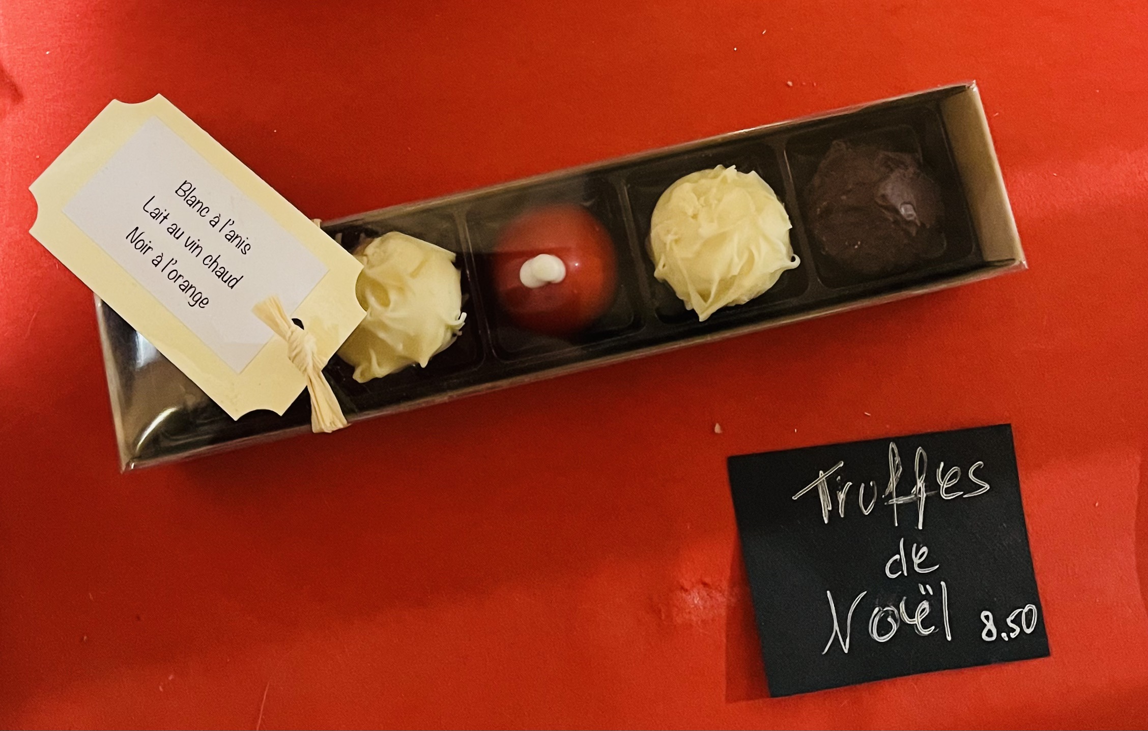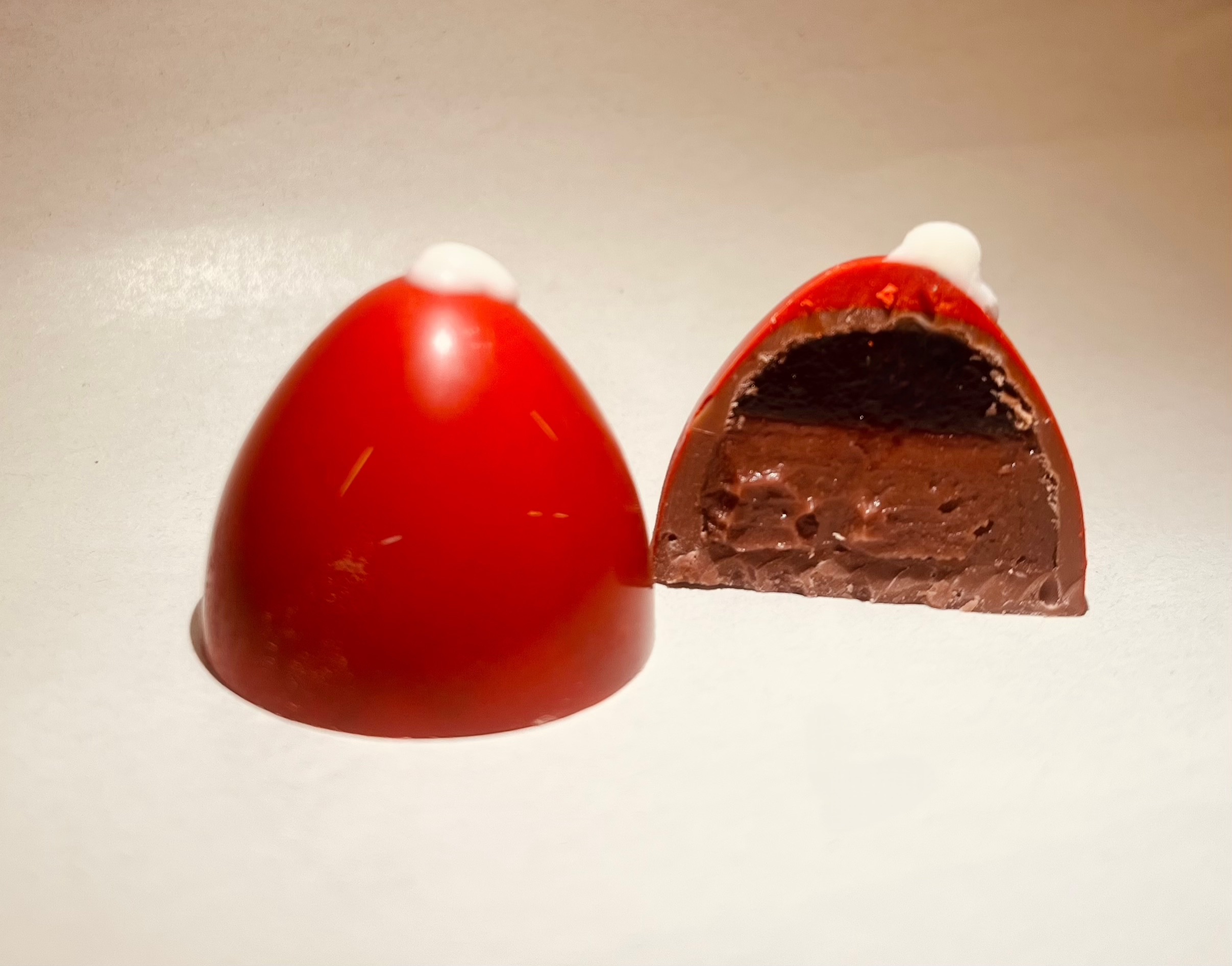 1 truffe, en forme de bonnet, ganache chocolat lait  au vin chaud et gelée de vin chaud